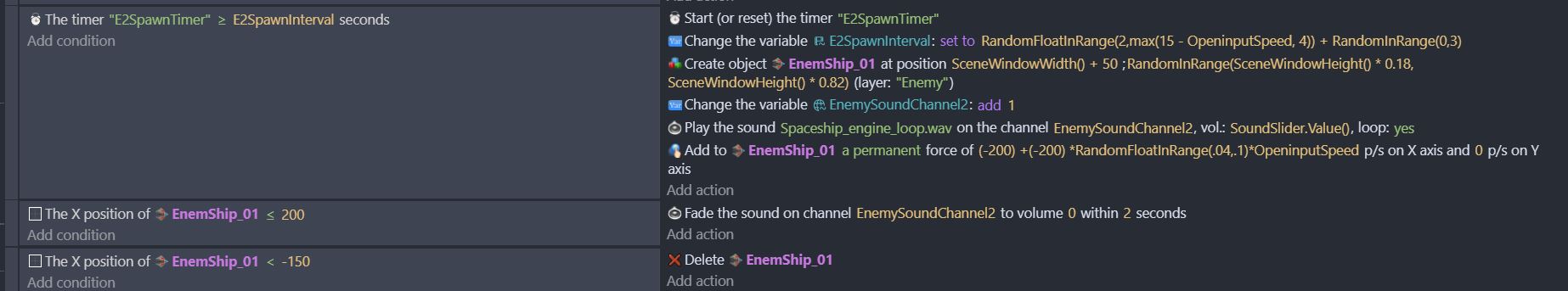 My math is not good. I got it from Grok. I will try changing this if this is what causing the issue. But I have a doubt, even if force is giving me a decimal, won’t the EnemyShip_01 will always be crossing 200 pixel mark of screen left? So why a decimal in force can cause the failure of fading or stopping audio check as the condition is to check position of the object.