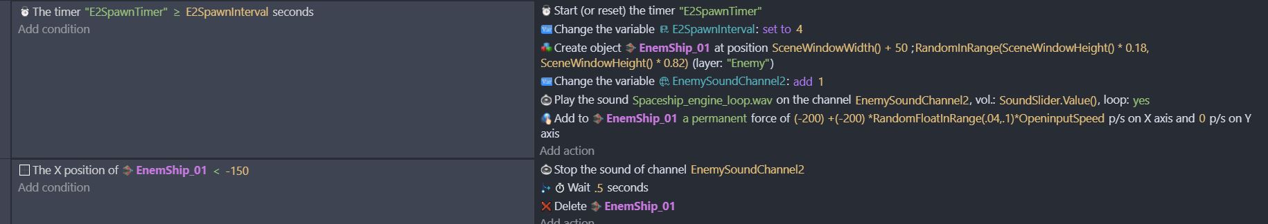Ship is created on the right side of the screen randomly and it is travelling to the left side of the screen. -150 is left side of the screen as zero is the left edge so 150 pixels outside of the left. Inam sorted with the ship logic. My issue is with the sound only. Sound is looped and played on a unique channel and I just want it to stop when the ship is deleted. That’s all.