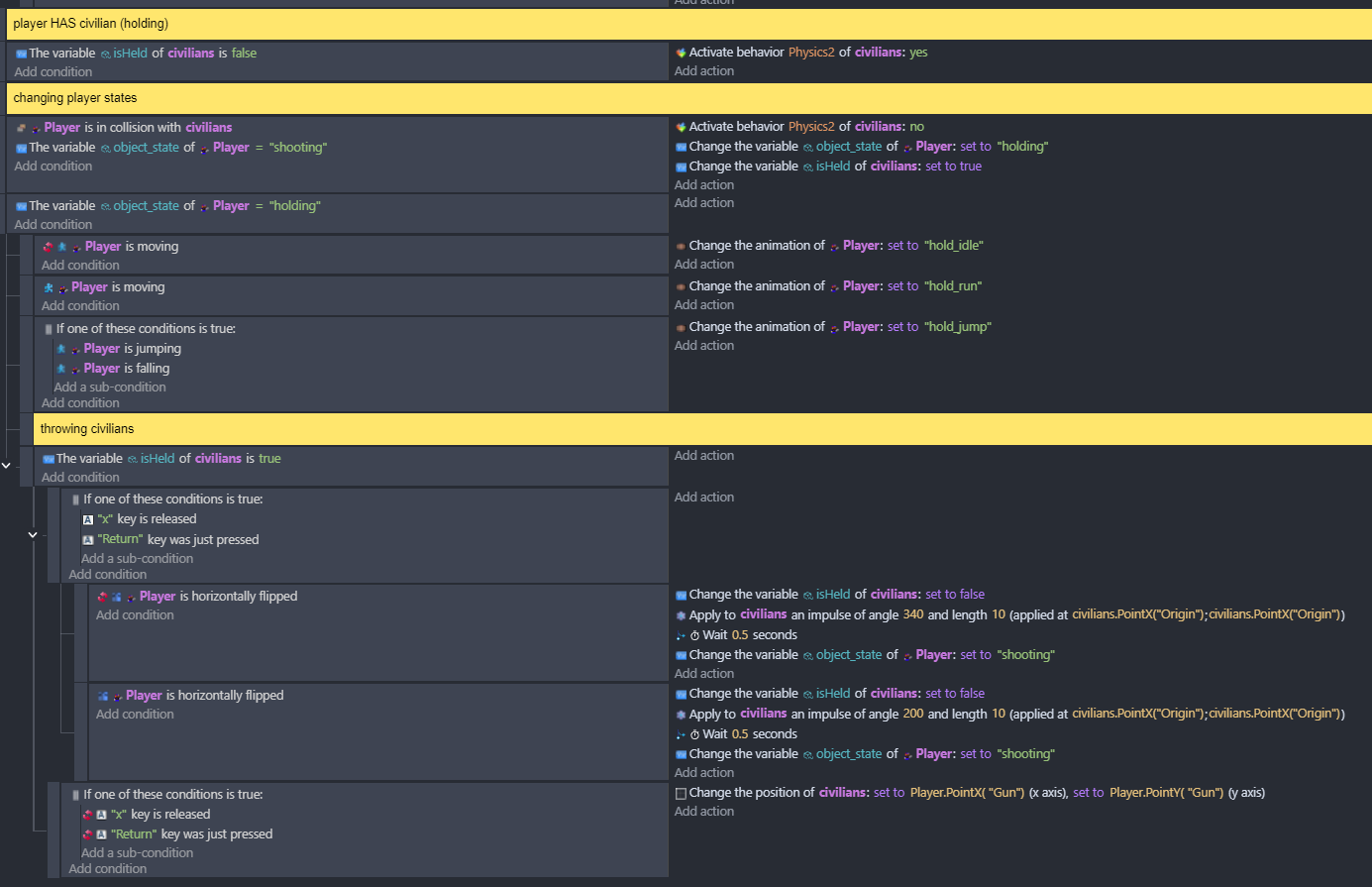 My ground tiles and objects contained in “civilians” family both have Physics2D Behaviour. When you pick them up your player state changes and they follow player position. Then, when you press the button, an impulse is applied to civilian sprite.