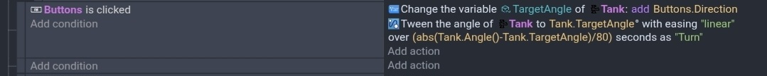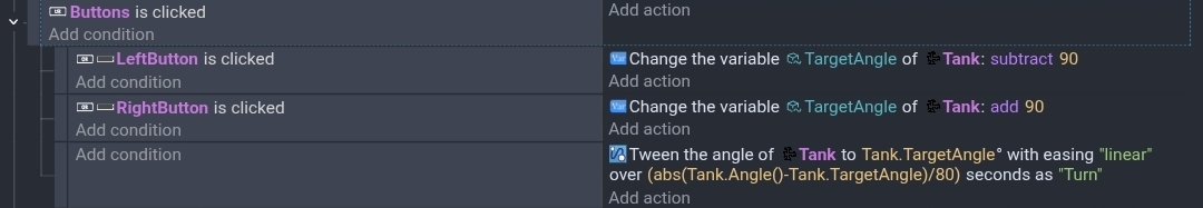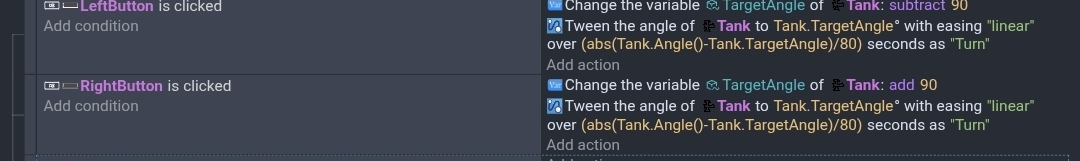 I started using an object variable named TargetAngle to the tank. The premise is to increase or decrease the variable. Then calculate the tween time based on the difference between the current angle and the target.
