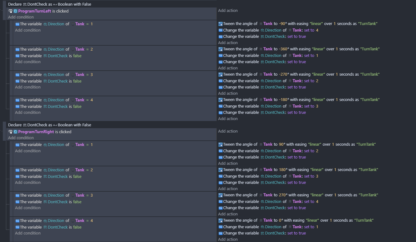 I need a tween or rotate function that doesn’t have a “hitch.” Essentially when the player uses turn left or turn right it should rotate that direction 90 degrees. As it is right now, what happens is kind of random. If you use the left turn, and just left, it will do it correctly 4 times and then it will rotate to the right 270 degrees on the 5 press.