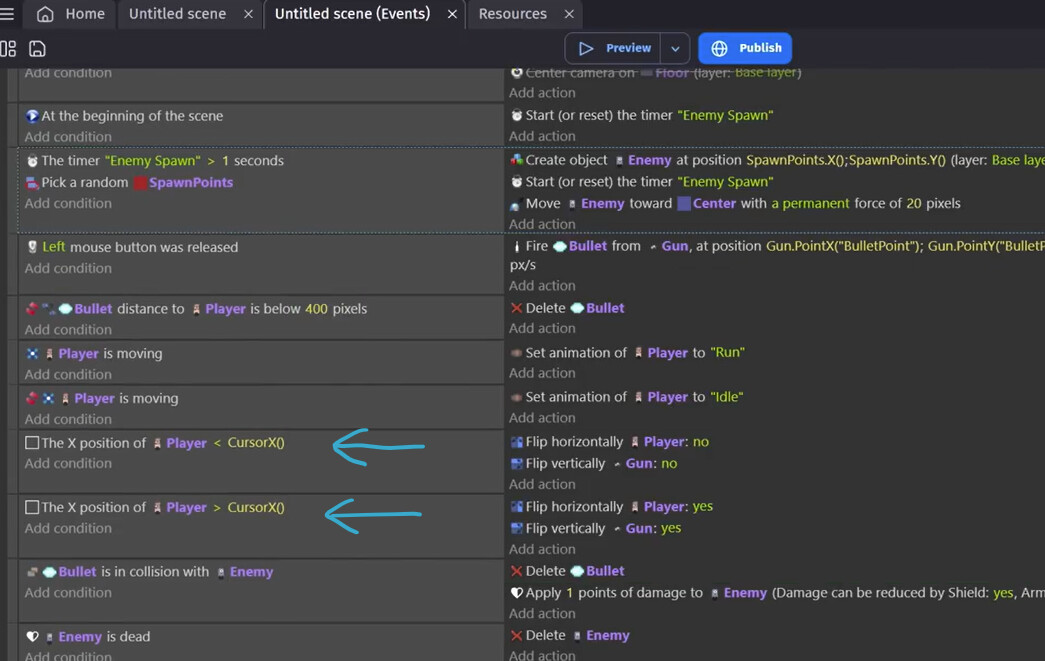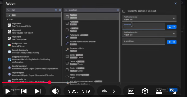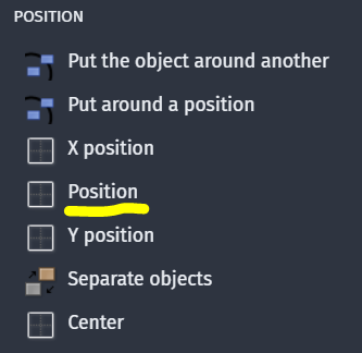 I’m doing the first “Make your own game” tutorial, and we’re supposed to add a “position” condition for the gun. All I see is “position x” and “position y”. I need to be able to specify both in one variable, like a vector I tihnk. But in the video, I can see him getting “position” right off the top for the event sheet, whereas I have no such option. I’m sure this is very common, if someone would take a quick second to clear this up for me, I’d be very grateful. Seems like I hit a dead end every few minutes here.