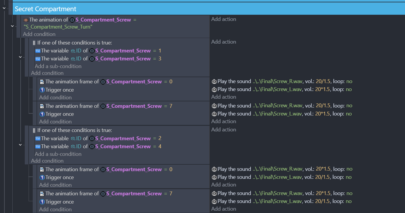 Yeah the sound system is definitely on the buggier side with even a small thing sometimes breaking it in terms of conditions. I’ve learned to walk around it but this time i’ve seem to hit a wall. I don’t want to just make a whole new sound file just for this puzzle since i’m gonna re-use that screw sound in the future on other parts of the game.