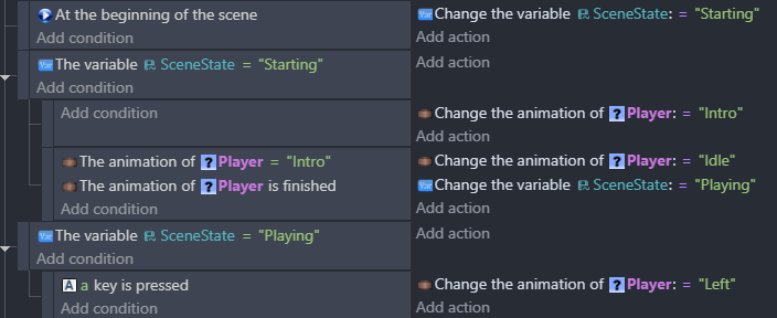 One solution is an FSM. But instead of it being for the player states, use it for scene states. Use a variable for this, say called SceneState. You could have “Starting” as the first state, “Playing” as another state etc. Each state has an event that begins with “Value of variable SceneState = 'state_name'”, with subevents that only get run when the scene is in the specified state.