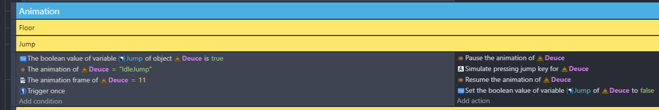 I have a 20ish frame jump animation. I want the animation to play until frame 16 and then simulate a jump. What would the correct format of the conditions/actions be for that? I have some really nice animations that I want to show off, I just need it to actually do what I want lol.
