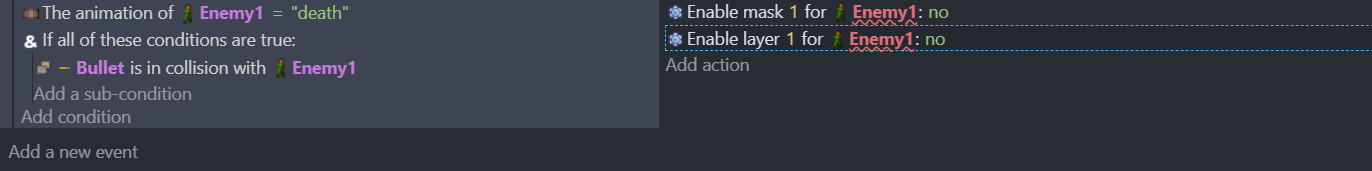 I don’t have 2d physics behavior on enemies, since it does weird stuff in gameplay. But even when I add 2D physics I’m still not able to disable collision to stop this problem.