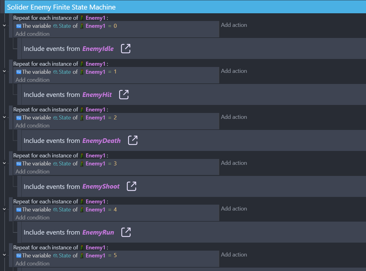 Going by your previous post, I’d say you could do with enemy states “Idle”, “Run”, “Attack”, “Hit” and “Death”.