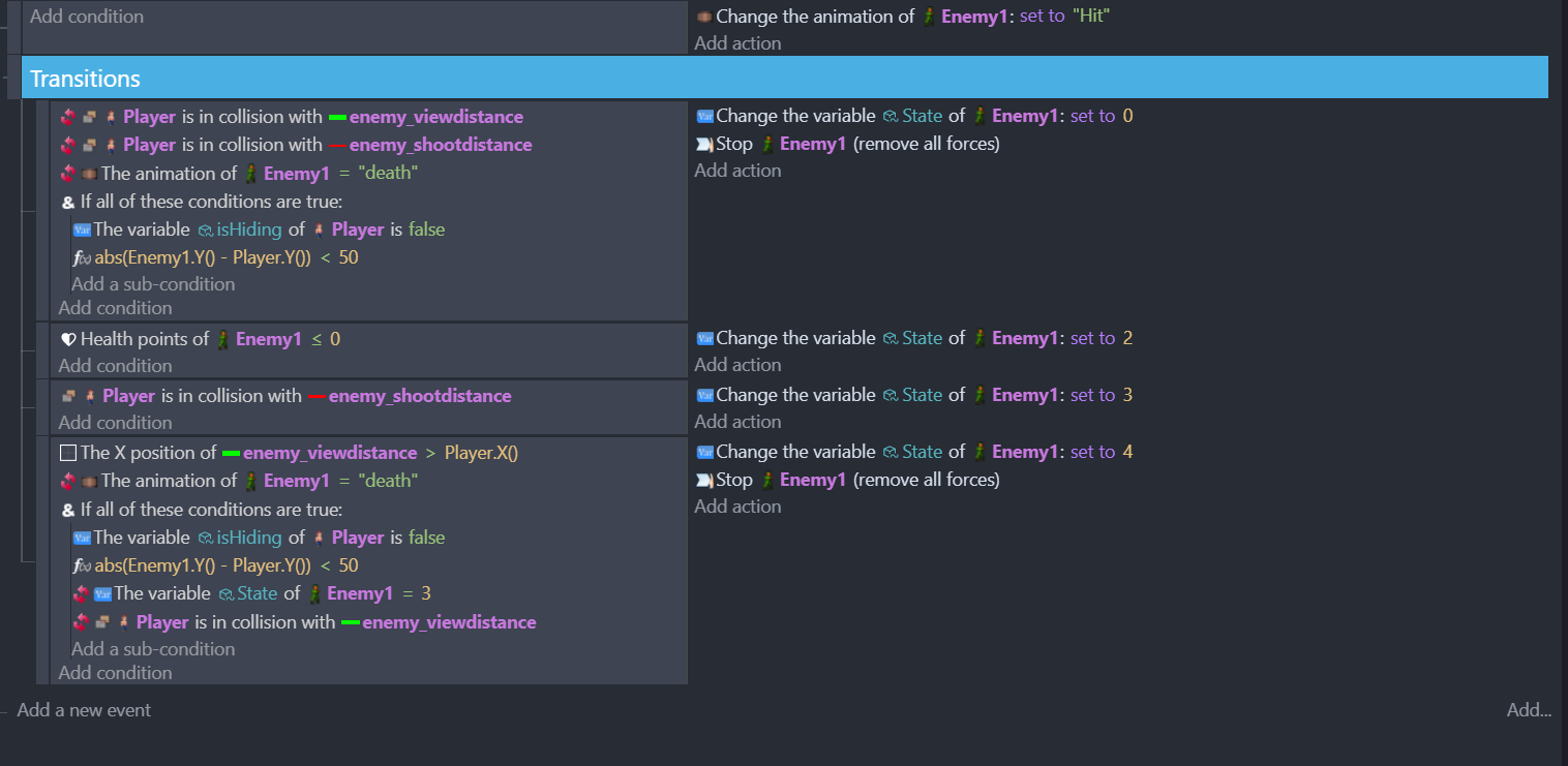 Just to change the animation. I have the damage being calculated in the main scene event list. Everything else transitions out of Hit. Idle, Death, Shoot, Run.