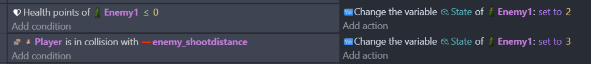From hit, the enemy can go to idle or death states. In hit and death states, the enemy cannot be hit and no checks are made for collision between enemy and bullet.