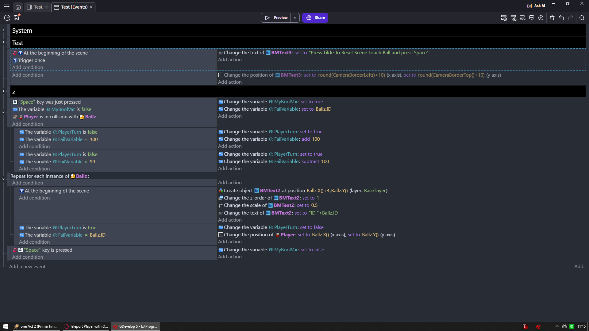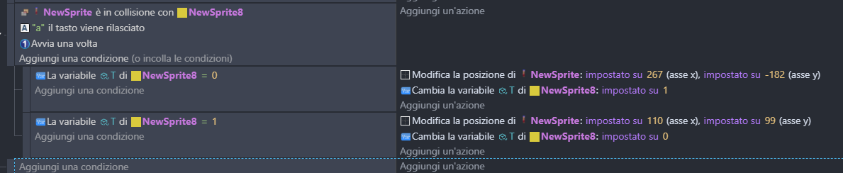 I’m trying to create a teleport system within the same scene, like switching between rooms. My NewSprite is the player, and the doors are represented by two rectangles (NewSprite8) in the scene. The idea is that when the player collides with a door and presses a key, they are moved to a specific position in the scene (simulating moving to another room) and then, on the next press, return to the original position.