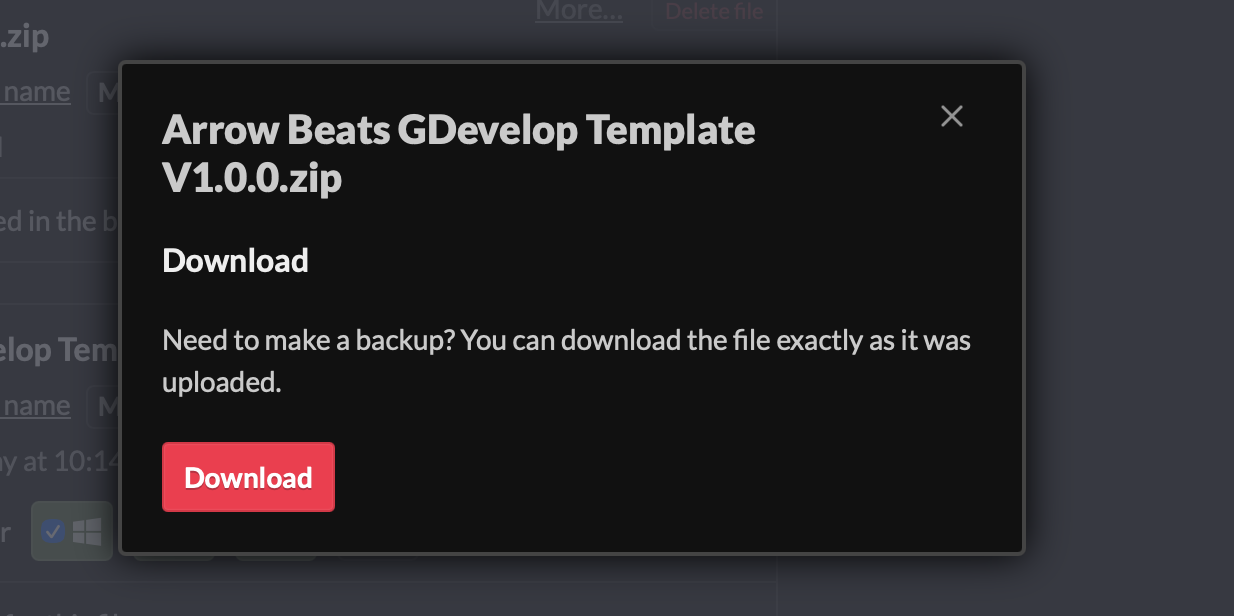 If you save the game to a file on your computer, you could then proceed to post that on itch. If you didn’t want people downloading the file, you could put it in a private project or disable downloads, and pretty much just use itch as a project storage site. You can easily redownload the file from itch, by simply clicking the “more” button next to the file name. Once you click more, you will get this popup: