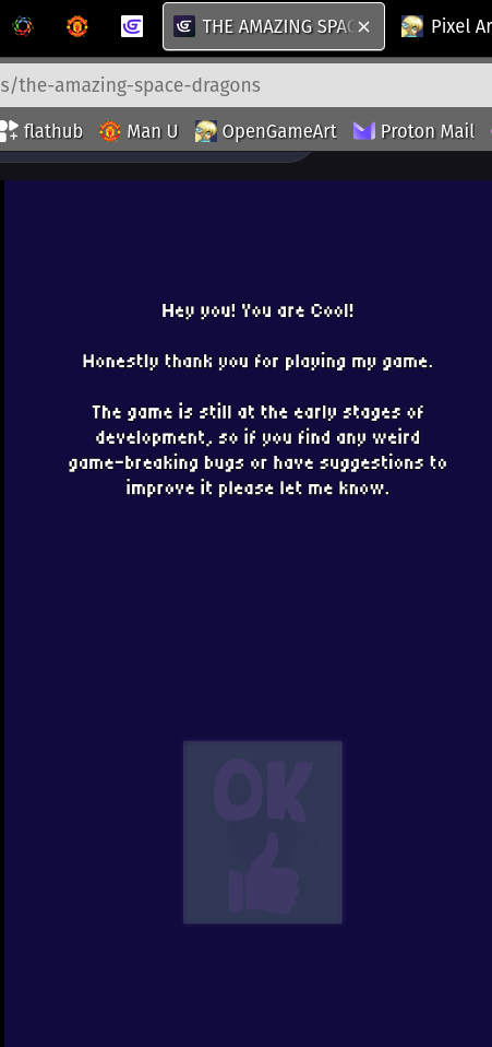 My feedback, firstly, there were 3 loading screens before I could play and it took about 5 minutes for them to load. Maybe there was a temporary connection glitch, I don’t know. Or are your sprites/other assets really big in file size?