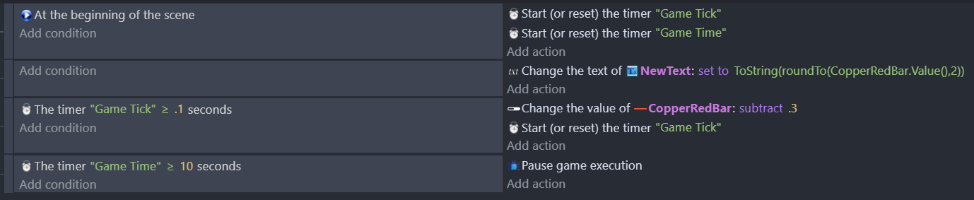 - Have you tried using a variable that just adds timedelta instead of a timer? (I.e. have an event that checks if timevariable > 0.1 to set it back to 0, and have another event that just runs every frame without condition and does an action thet does timevariable + TimeDelta())?