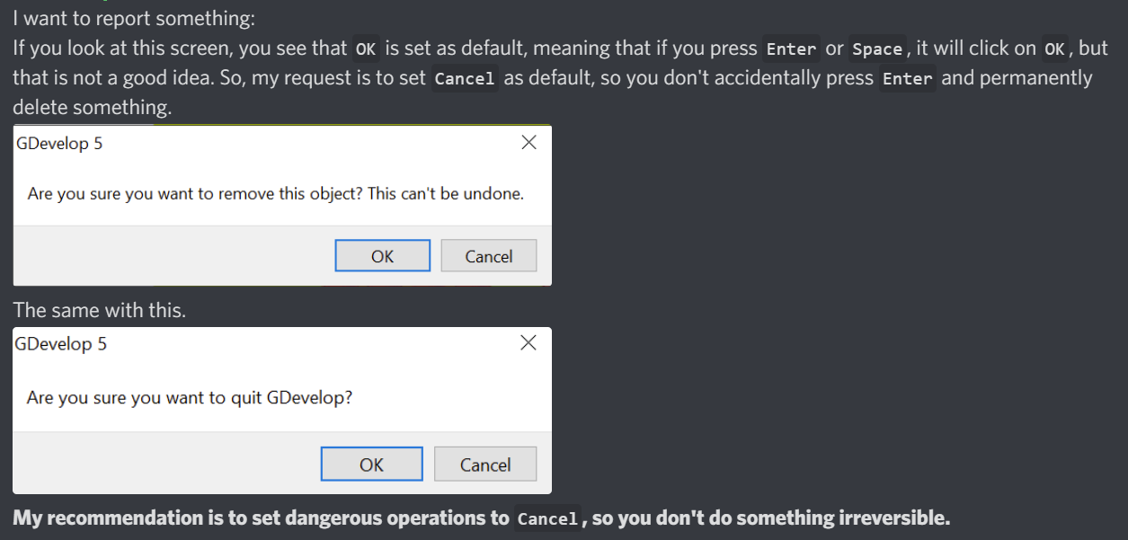GDevelop follows standard practice: Enter means confirm, Escape means cancel.