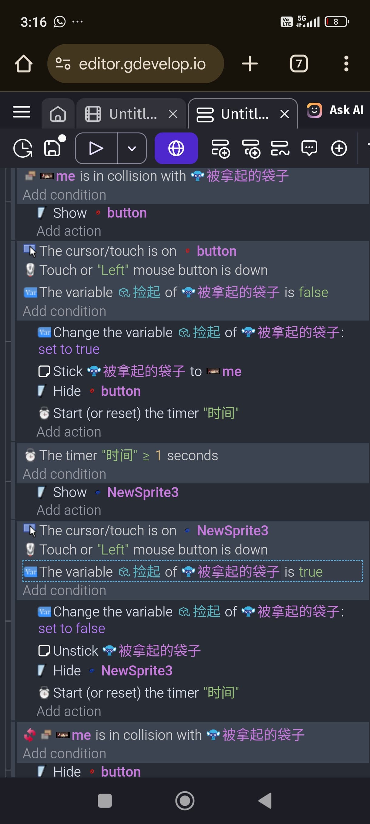 (1) I need to allow the player to pick up a trash bag and move it somewhere else to throw it away. I set up the first event so that if the player collides with the trash bag, a button will appear. Then, if the second event is pressed, the trash bag will be stuck to the player using a sticker. However, it seems to be stuck even before the player touches the trash bag, and even before the button appears! Not only that, after dropping the trash bag, if the player moves to a distant place, the trash bag also moves! And when I pick up the trash bag and move it, it disappears for no reason! Can someone please help me?