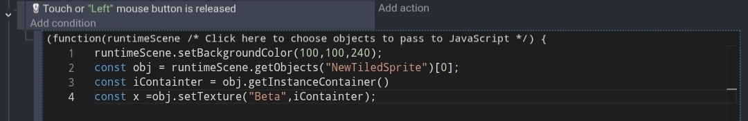 Yeah I was thinking, since there’s an action for changing an image for the tiled sprite, there must be underlying code for it that I should be able to replicate. So I’ve been relentlessly going through the github files for the tiled sprite extension itself and so on, but couldn’t find what the difference is between how it’s in the files vs this code you have (which is where I got the code from, you posted it in another thread some time ago