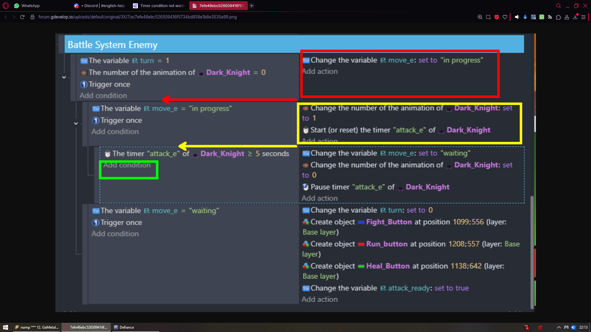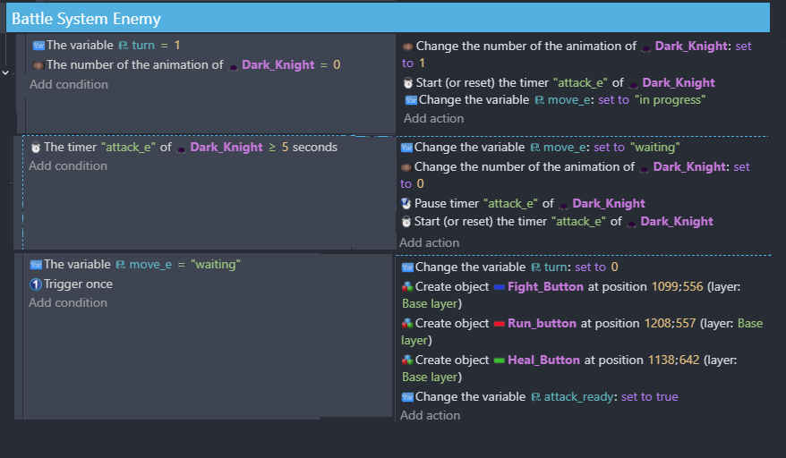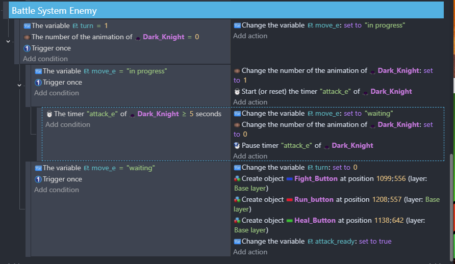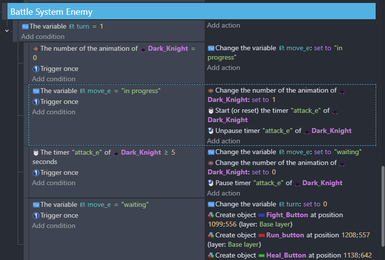 nothing happens after the enemy attacks in the second event. But I can see in the debugger that “turn = 1” “move_e = ‘waiting’” and that the timer is running. So I know the issue is with the third event with “the timer ‘attack_e’ of dark_knight >= 5 seconds”
