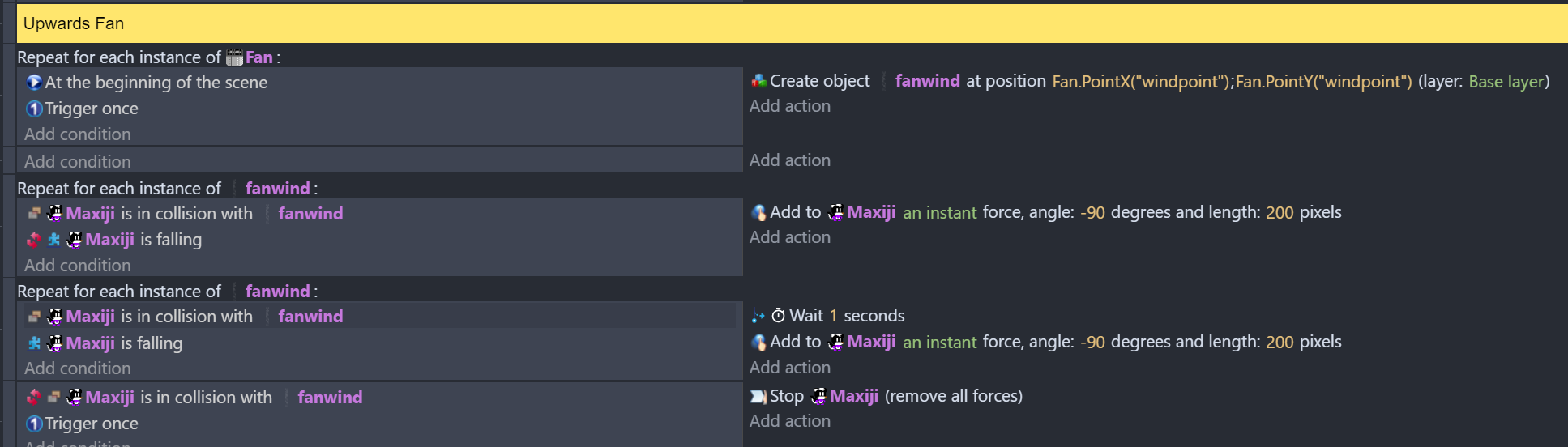 I had the wait action out in to give of the illusion of gravity pushing you back down, before the fan’s force catches up. Like rubber band. I might try out removing the “for each object” condition and see how that works.