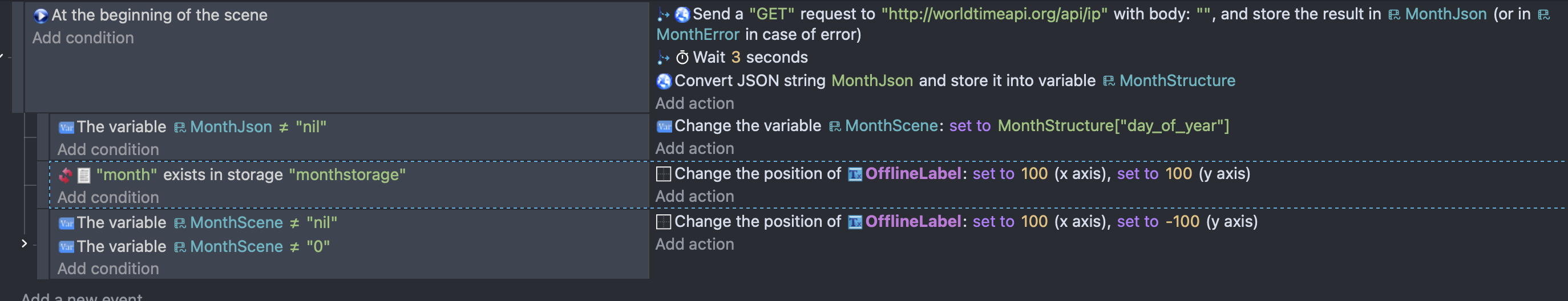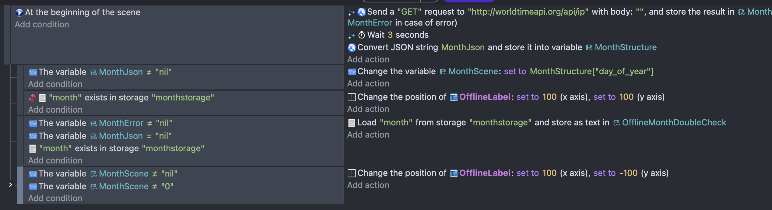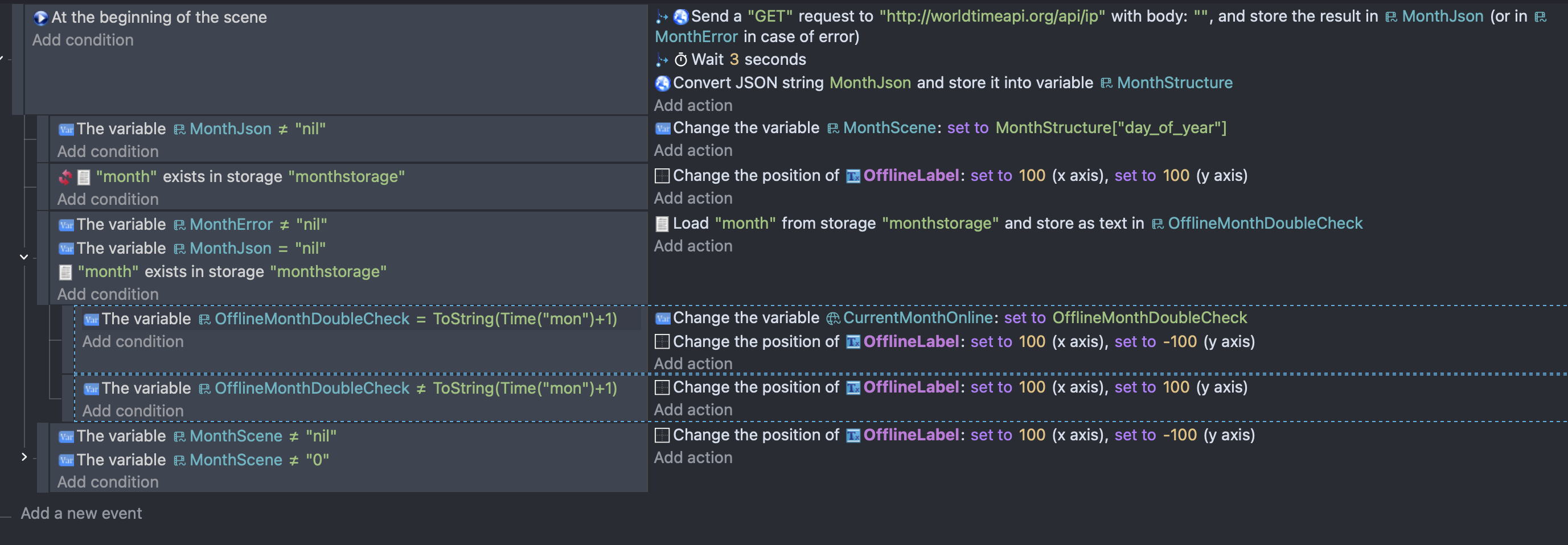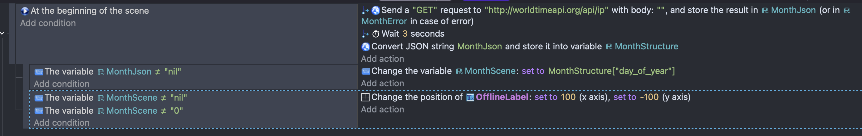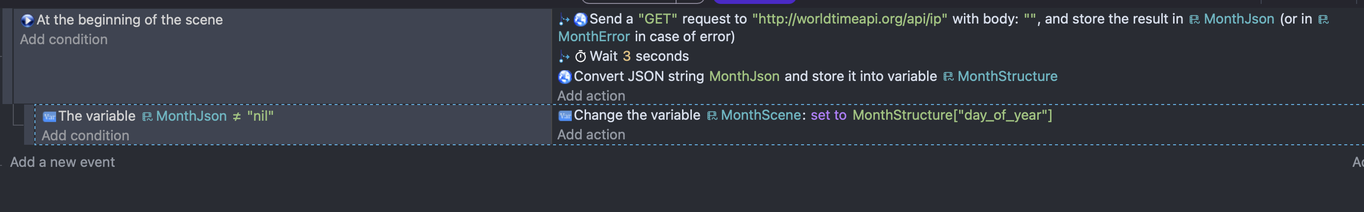 Now if the MonthJson is NOT equal to nil, that means it has successfully got the API from the website, and we can continue to get the Day of Year from the structure. Now your MonthScene variable will equal whatever day of the year it is.