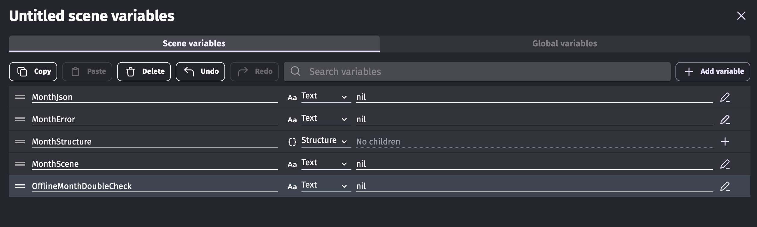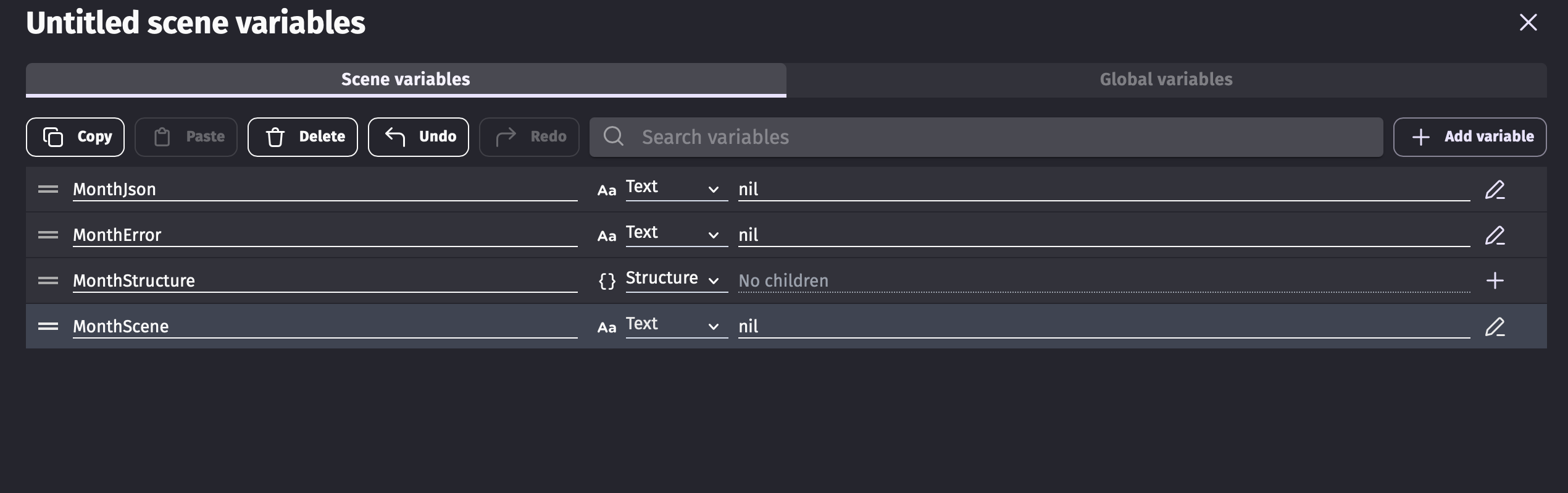 Now create 2 more variables named MonthStructure (empty structure) and MonthScene (“nil” text).