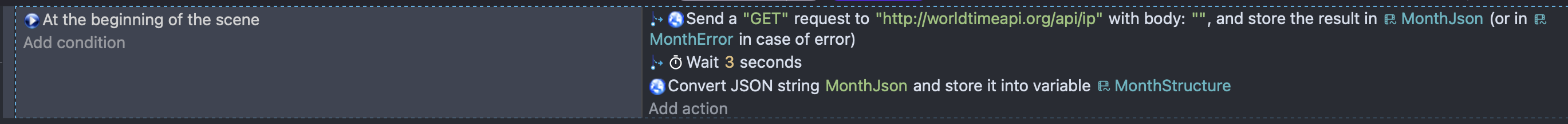 Now wait 3 seconds, and convert JSON string “MonthJson” to variable “MonthStructure”. The reason we wait 3 seconds is because sometimes it takes the GET request a few seconds to load.