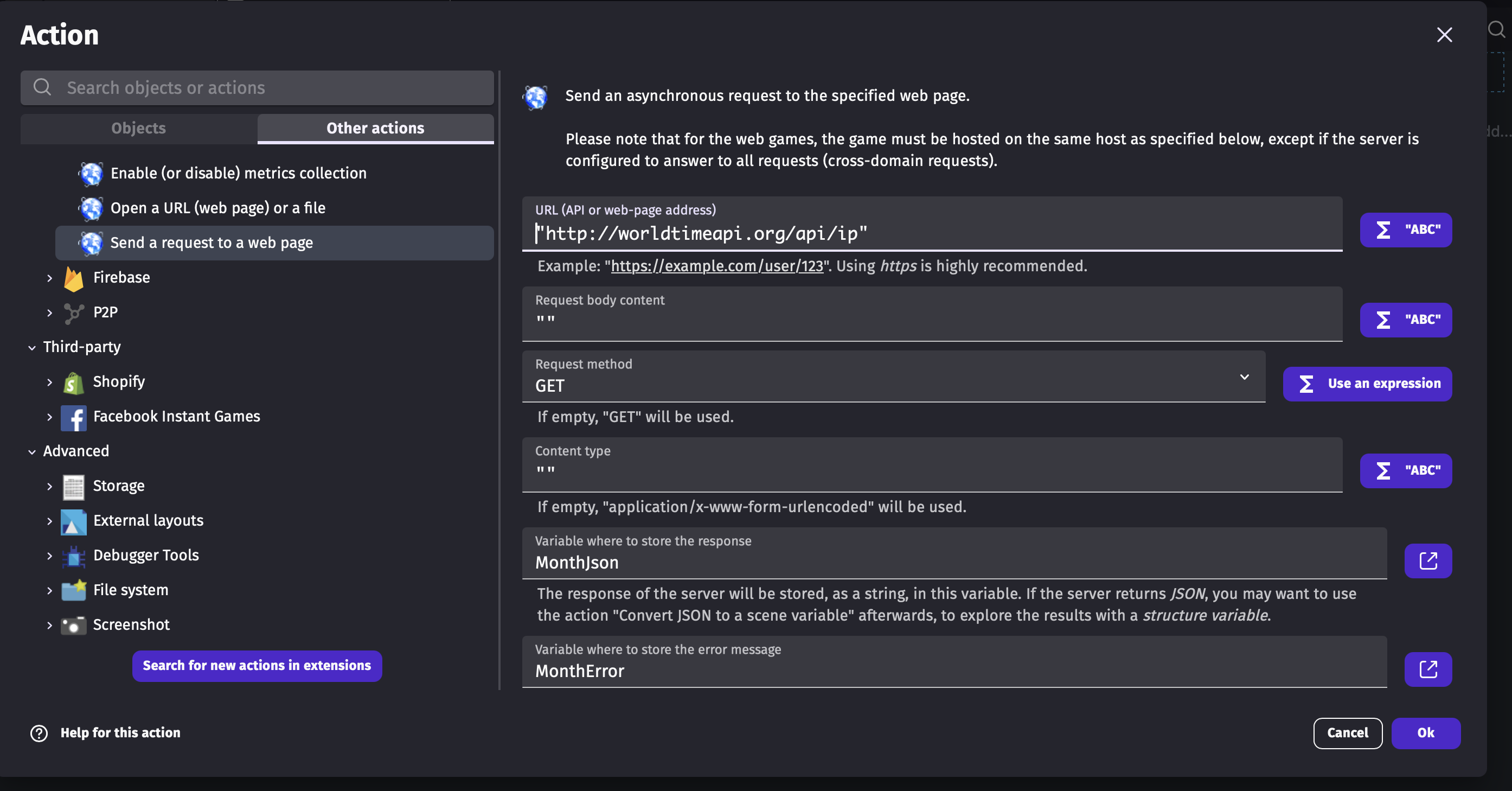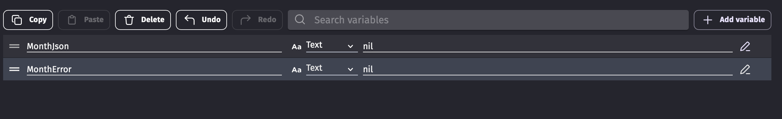 Set up 2 variables named MonthJson and MonthError, both text variables with a text of “nil”.