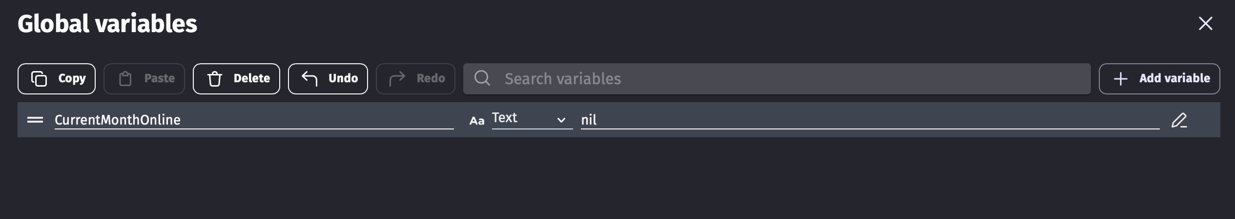 Now set up a global variable called “CurrentMonthOnline”. This variable will track what the current online month is.