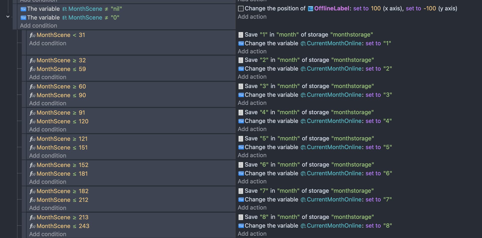 Now we just do a quick double check here that MonthScene is not “nil” or “0” meaning that we have a valid month and the player is in online mode. Since they are in online mode, we move the label off screen.