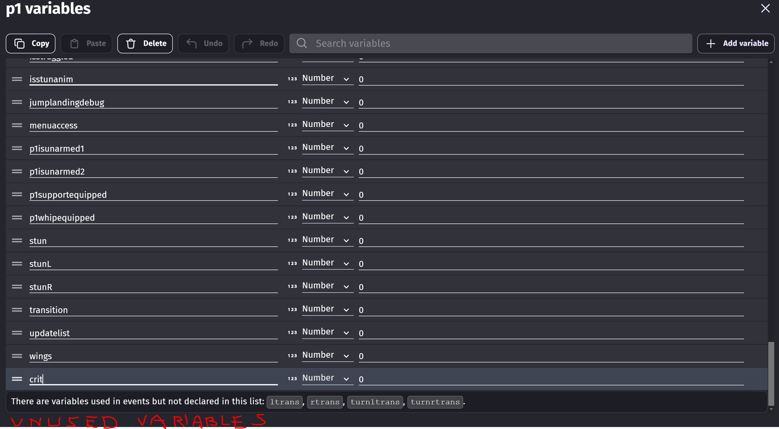 My current method for finding unused variables is to give any variable I think might be unused, a very unique name and then do a search for that name in the events. But there can be multiple external events sheets etc and it would be much easier if they were automatically listed.