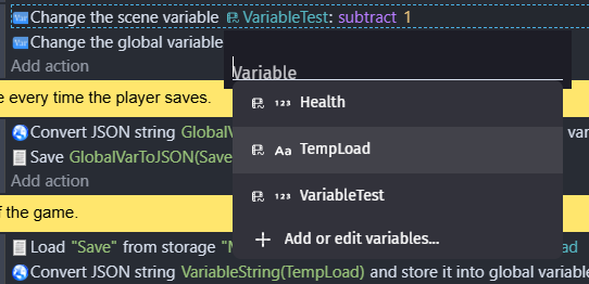 Or you can access the full variable editor simply by clicking the add or edit variables button. Similarly, when using an expression, you can access all valid variables for that expression (text/number/etc) in the drop down typeahead.