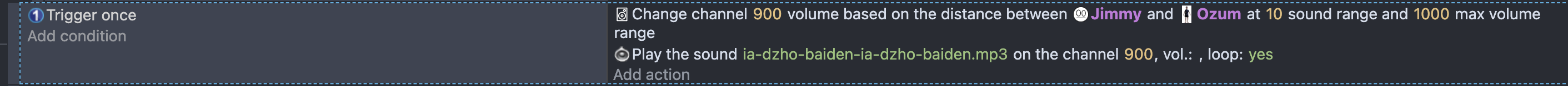 I think I said in your previous post that I link volume on channels to (1/distance between objects)*10000β¦if thereβs more than one instance you need to be specific about which one.