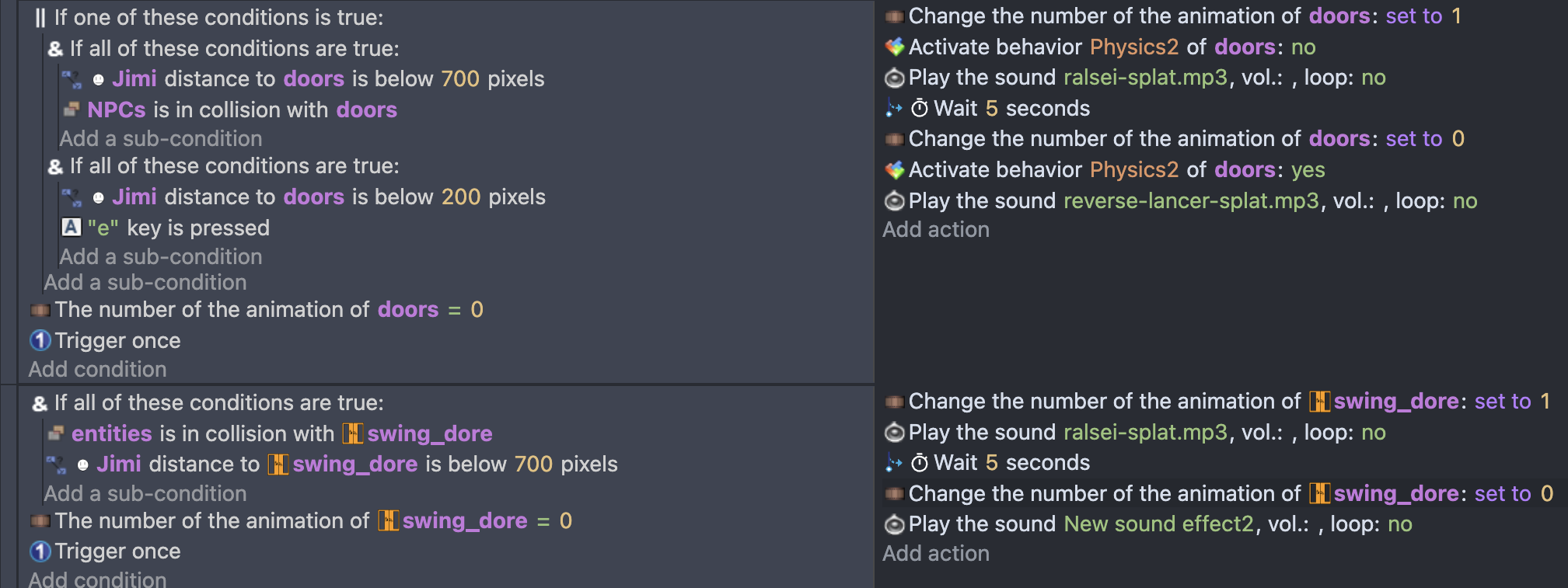 There’s 2 door types and both can only be opened when the player is nearby so there’s no cacophony of door noises 24/7 since i have no clue how to make spatial sound work, but the swinging one can’t be opened by anything except player even when they’re nearby, even thought it works exactly the same with NPCs as the other door. The NPCs are in the needed group, with no messpellings in the names.