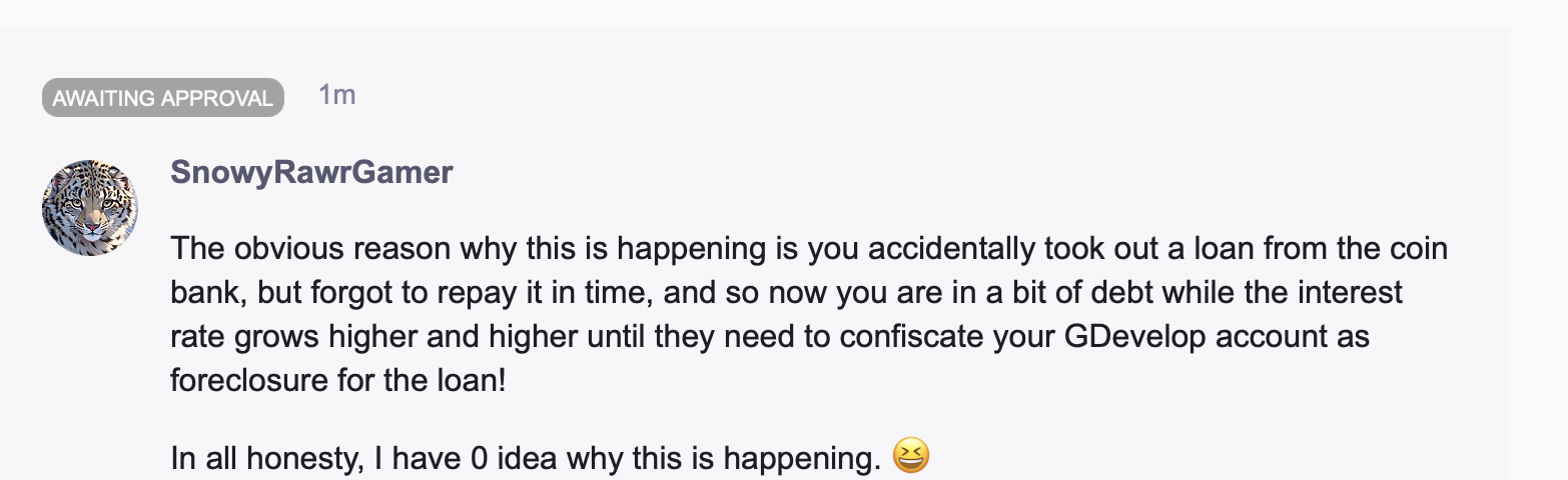 I made a post responding to someone who had -6 GDevelop coins in their account, and my post got flagged as off-topic since I was trying to act like petlimpet ![]()